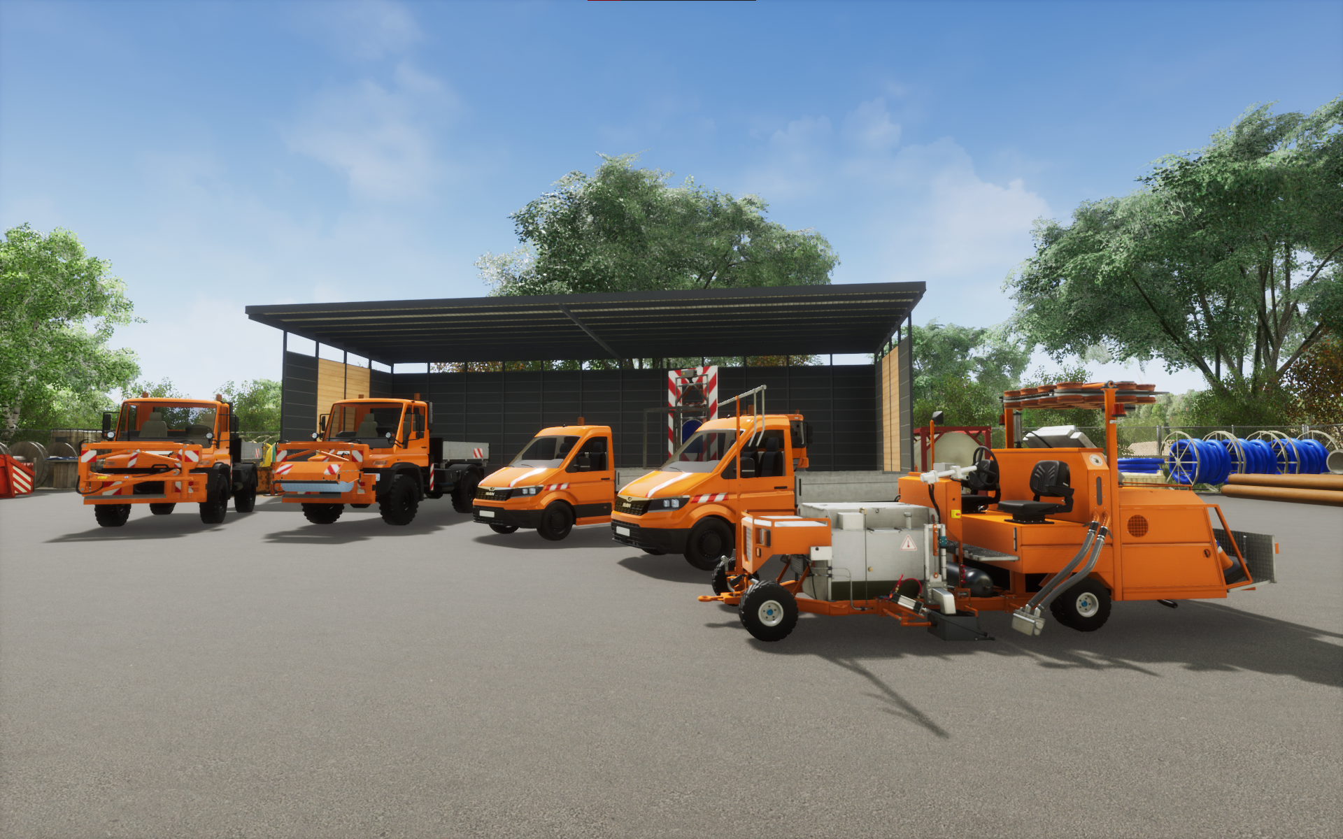 - Mehr als 8 verschiedene Straßenmeisterei-Fahrzeuge, wie zB Planierraupe, Allzweckfahrzeug und Kipplader