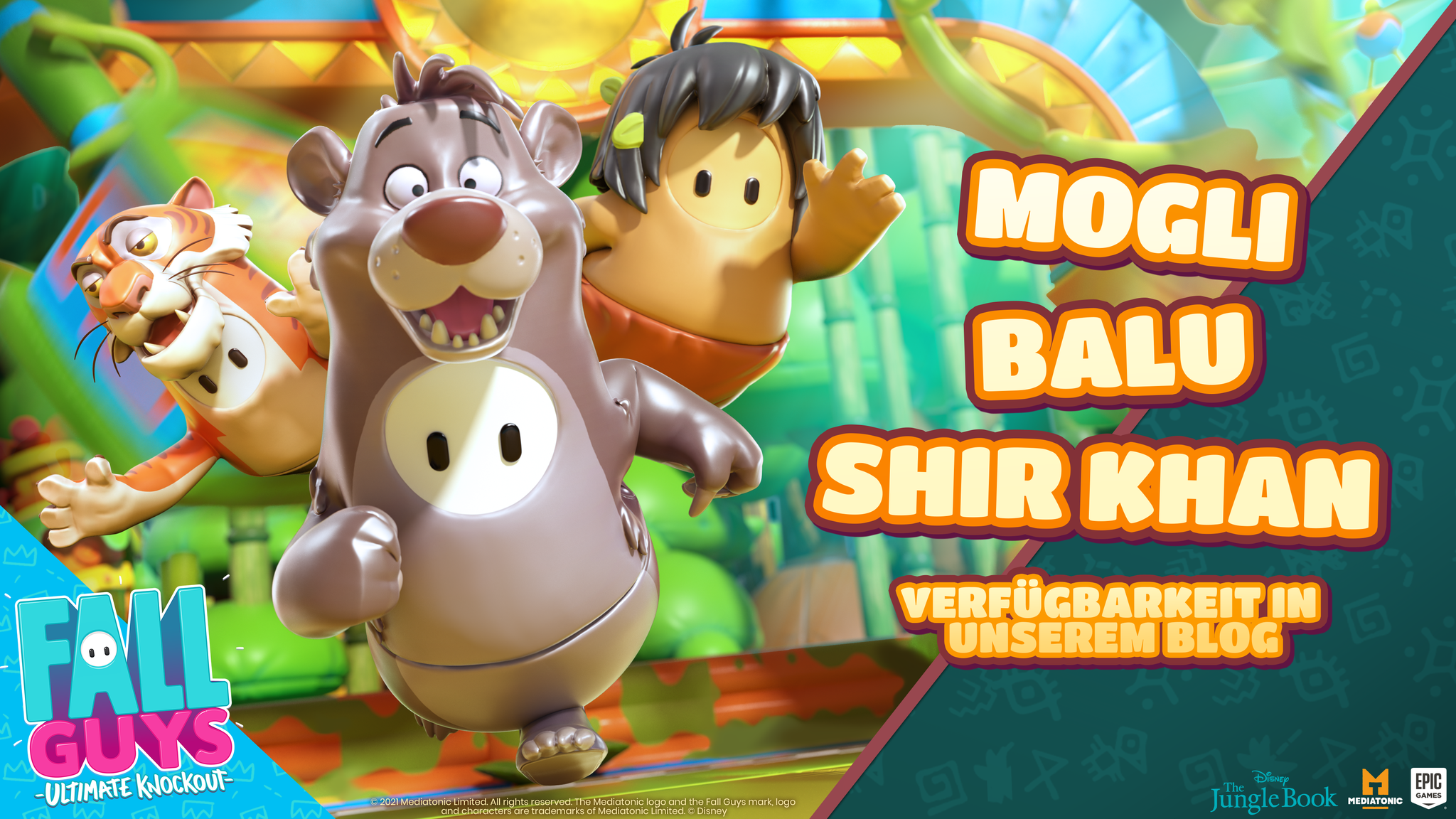 Ab heute, dem 03. September, wird es möglich sein, nacheinander die Kostüme von Mogli, Shir-Khan und Balu im Ingame-Store zu erwerben, um dann in der Haut der bekannten Figuren des Klassikers von 1967 durch die Dschungelwelt der Saison 5 von Fall Guys zu schwingen.