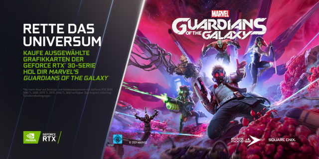 NVIDIA kündigte heute an, dass Spieler für einen begrenzten Zeitraum eine digitale Kopie des Spiels Marvel’s Guardians of the Galaxy beim Kauf von bestimmten GeForce-RTX-Desktop- oder -Laptop-Systemen dazu erhalten. Das Angebot gilt für zahlreiche Laptop- und Desktop-Konfigurationen mit GPU-Modellen von der GeForce RTX 3060 bis hin zur GeForce RTX 3090.
