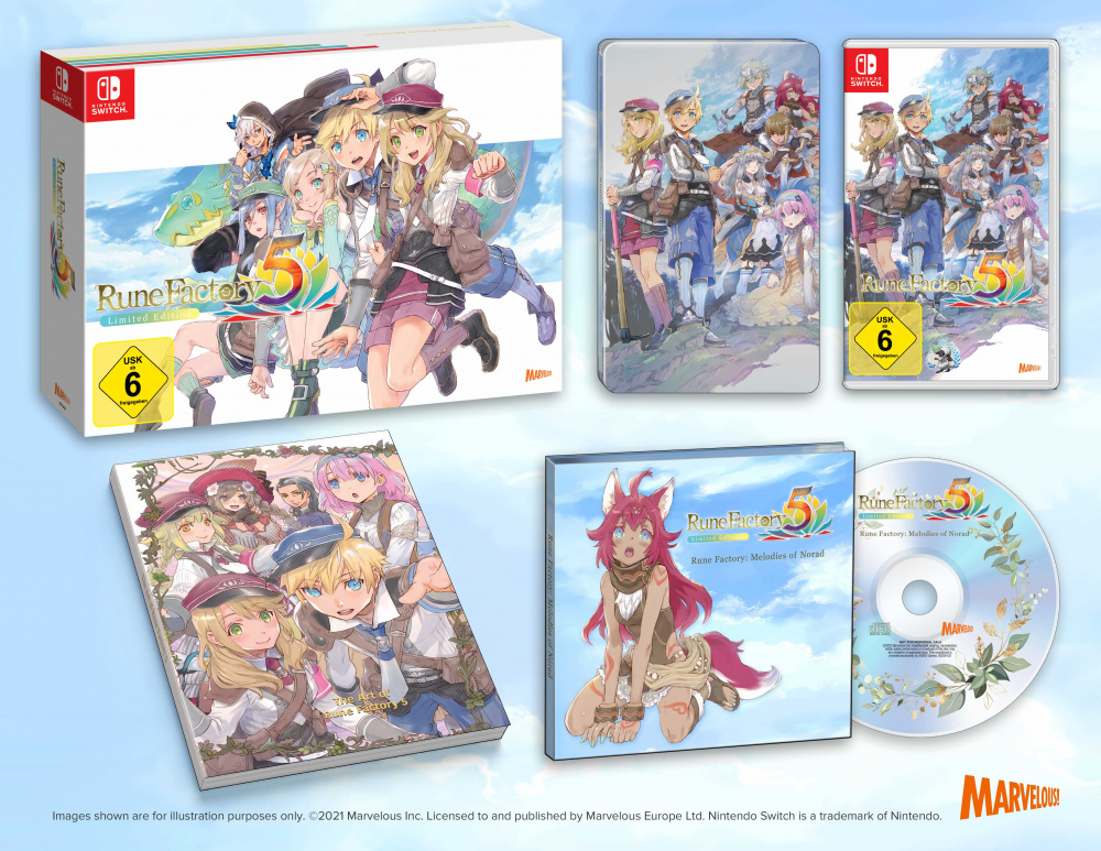 Die physische Limited Edition von Rune Factory 5 wird eine UVP von 79,99 Euro haben und neben einer physischen Version des Spiels weitere Sammlerstücke beinhalten. Zu diesen gehören eine prunkvolle Steelbook-Hülle, ein Softcover-Artbook mit Illustrationen des Spiels und die „Melodies of Norad“-Soundtrack-CD mit Musik der Rune Factory-Franchise. Neben diesen physischen Gegenständen enthält die Limited Edition auch exklusive Spiel-Inhalte in Form von zusätzlichen Kostümen für den spielbaren Charakter. Die Limited Edition wird bei teilnehmenden Händlern verfügbar sein. Weitere Details diesbezüglich befinden sich auf der kürzlich veröffentlichten Rune Factory-Webseite, dem Rune Factory Europe-Twitter-Account und auf der Marvelous Games-Webseite.
