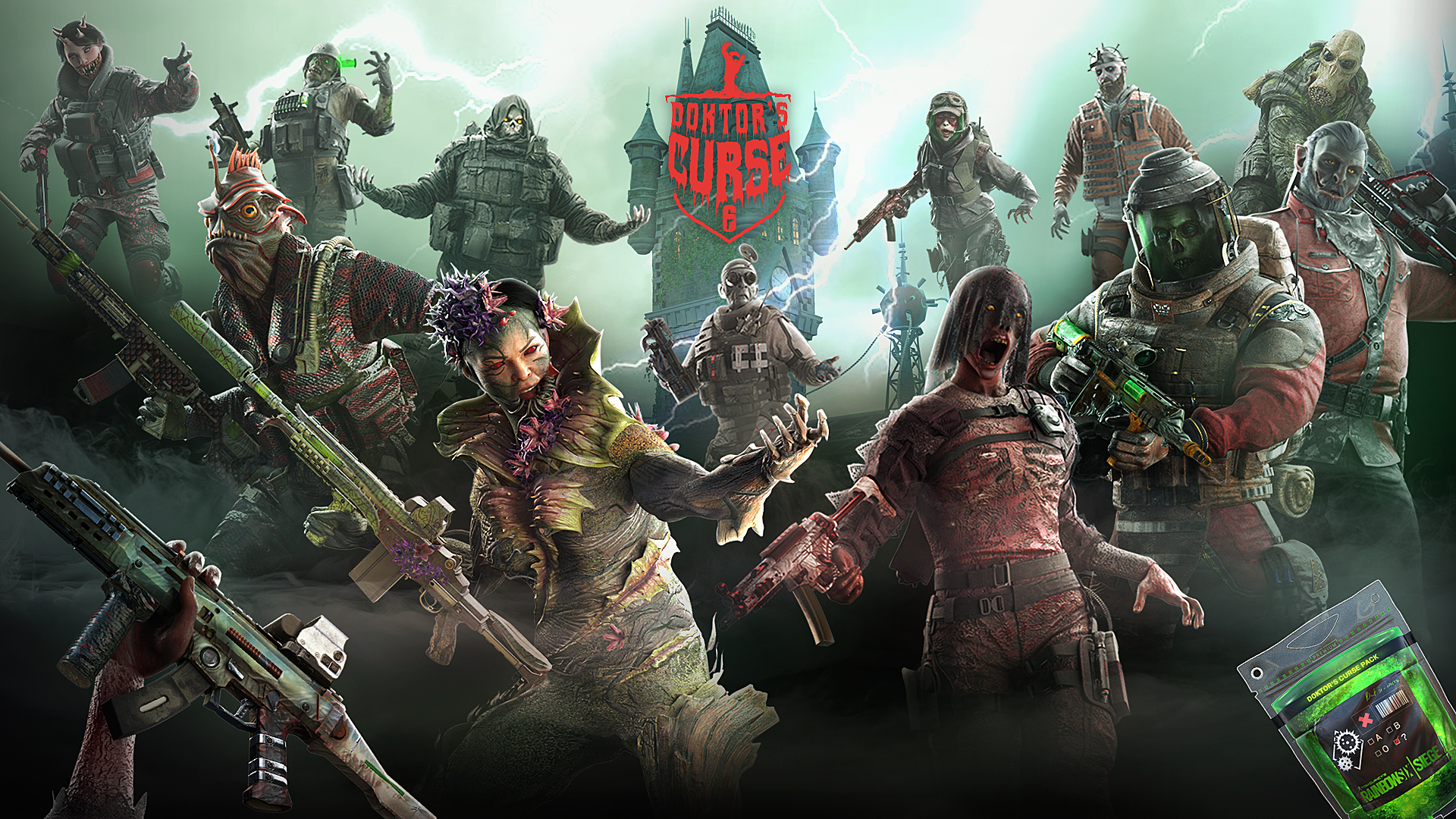 Die Doktor's Curse Kollektion, die Bundles für Smoke, Kapkan, Frost, Lesion, Doc, Bandit und Ela enthält, ist zurück und wird durch Bundles für die neuen Monster ergänzt: Jackal, Lion, Aruni, Melusi, und Kaid. Die Bundles sind für je 1680 R6 Credits oder über die Kollektionpacks für je 300 R6 Credits erhältlich. Jeder, der sich von morgen bis zum 2. November einloggt, erhält ein kostenloses Paket für Doktor's Curse und kann drei weitere Pakete erhalten, indem Ubisoft-Herausforderungen absolviert werden.