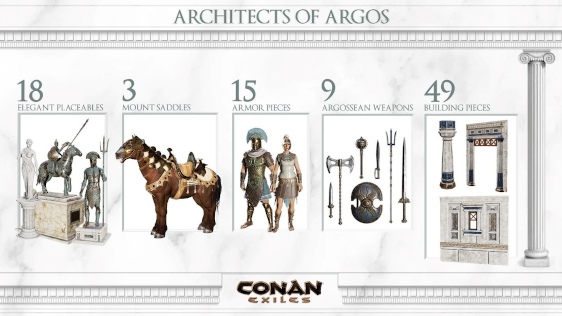 Architects of Argos provides 49 new building pieces and 18 placeables, as well as new weapons and armor. This means that there are now more than 500 different building pieces available in Conan Exiles, in addition to hundreds of pieces of furniture and decorative items.